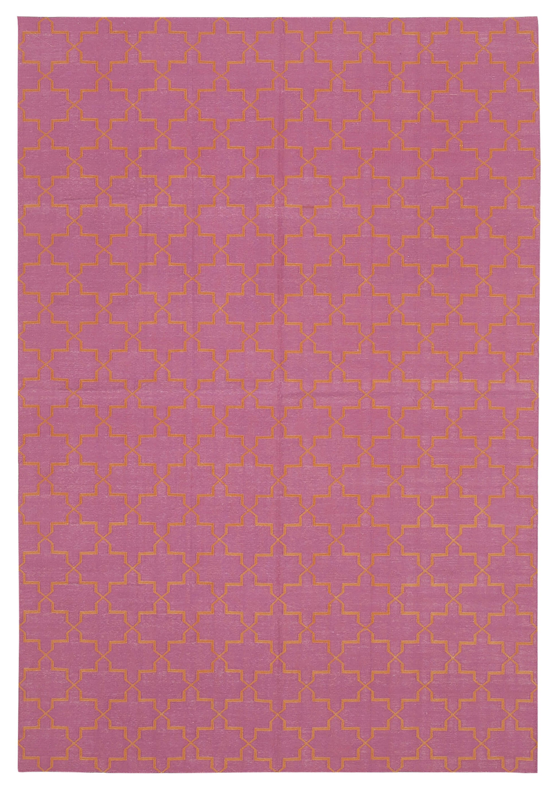 The rug features a captivating geometric pattern in a harmonious blend of pink and a complementary color, creating a visual delight that draws the eye. The intricate design is a testament to the skilled artisans who meticulously crafted it, ensuring each detail is perfectly executed. The cotton and wool weft and warp provide a sturdy foundation, while the vibrant colors add a lively touch to your decor. This rug is not just a floor covering; it's a statement piece that enhances the aesthetic of any space.