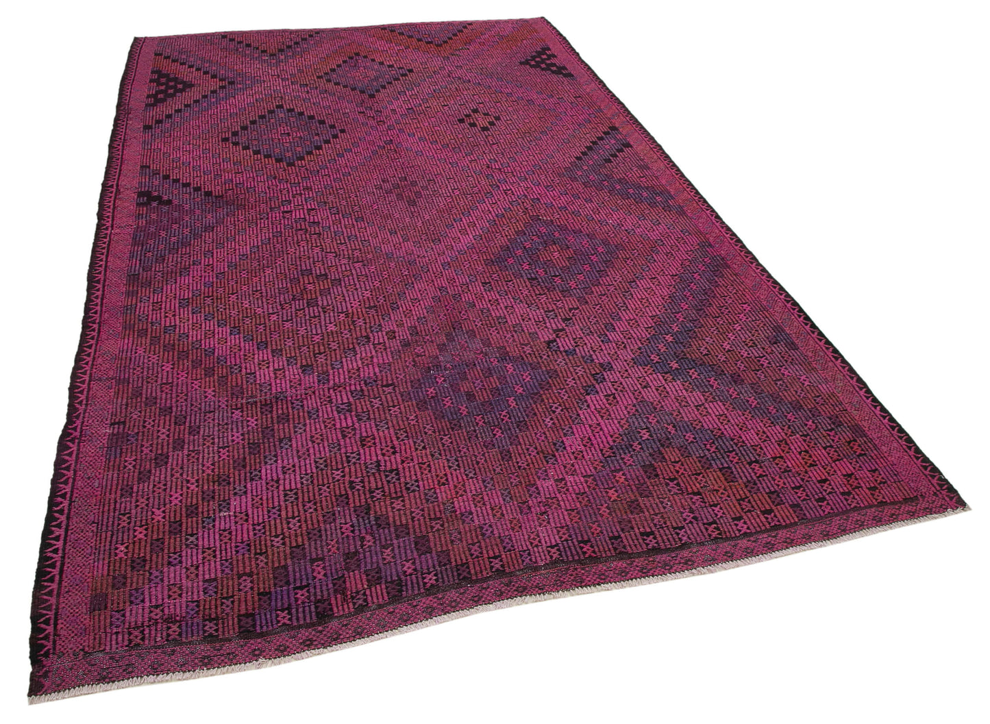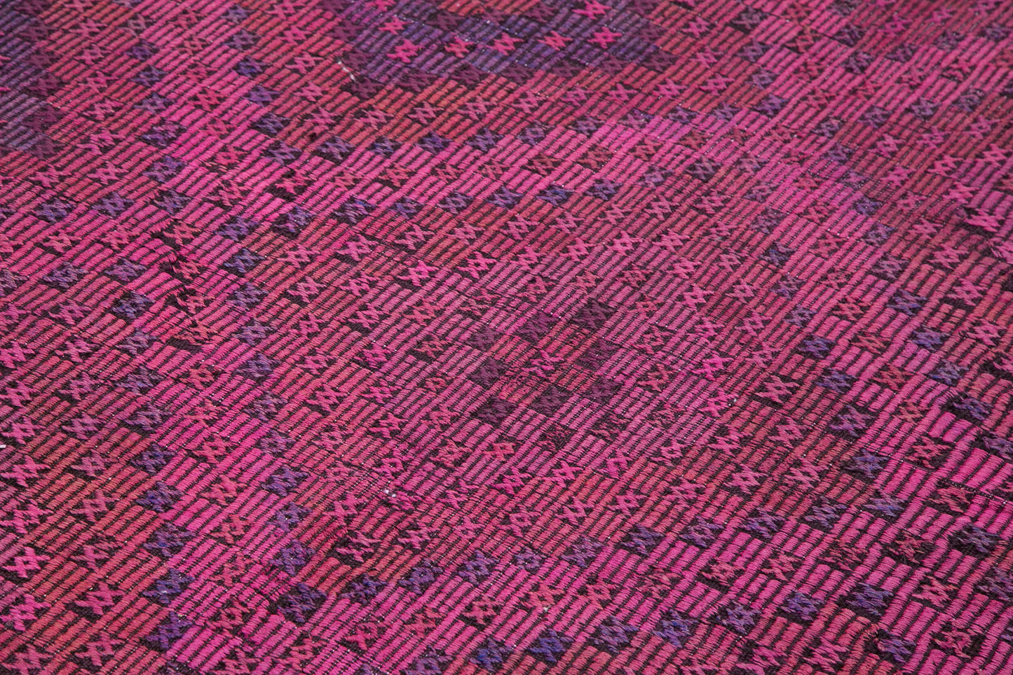 The design of this handwoven rug is a captivating blend of traditional motifs and vibrant colors. Dominated by shades of pink, the intricate patterns create a mesmerizing visual effect that draws the eye and adds depth to any space. The weft and warp of goat hair provide a robust structure, while the thickness of approximately 0.16'' (4.00 mm) ensures a comfortable and plush feel underfoot. The geometric patterns, featuring diamonds and other symmetrical shapes, are meticulously crafted, showcasing the artisan's expertise and attention to detail. This rug is not just a floor covering; it's a work of art that tells a story of cultural heritage and craftsmanship.
