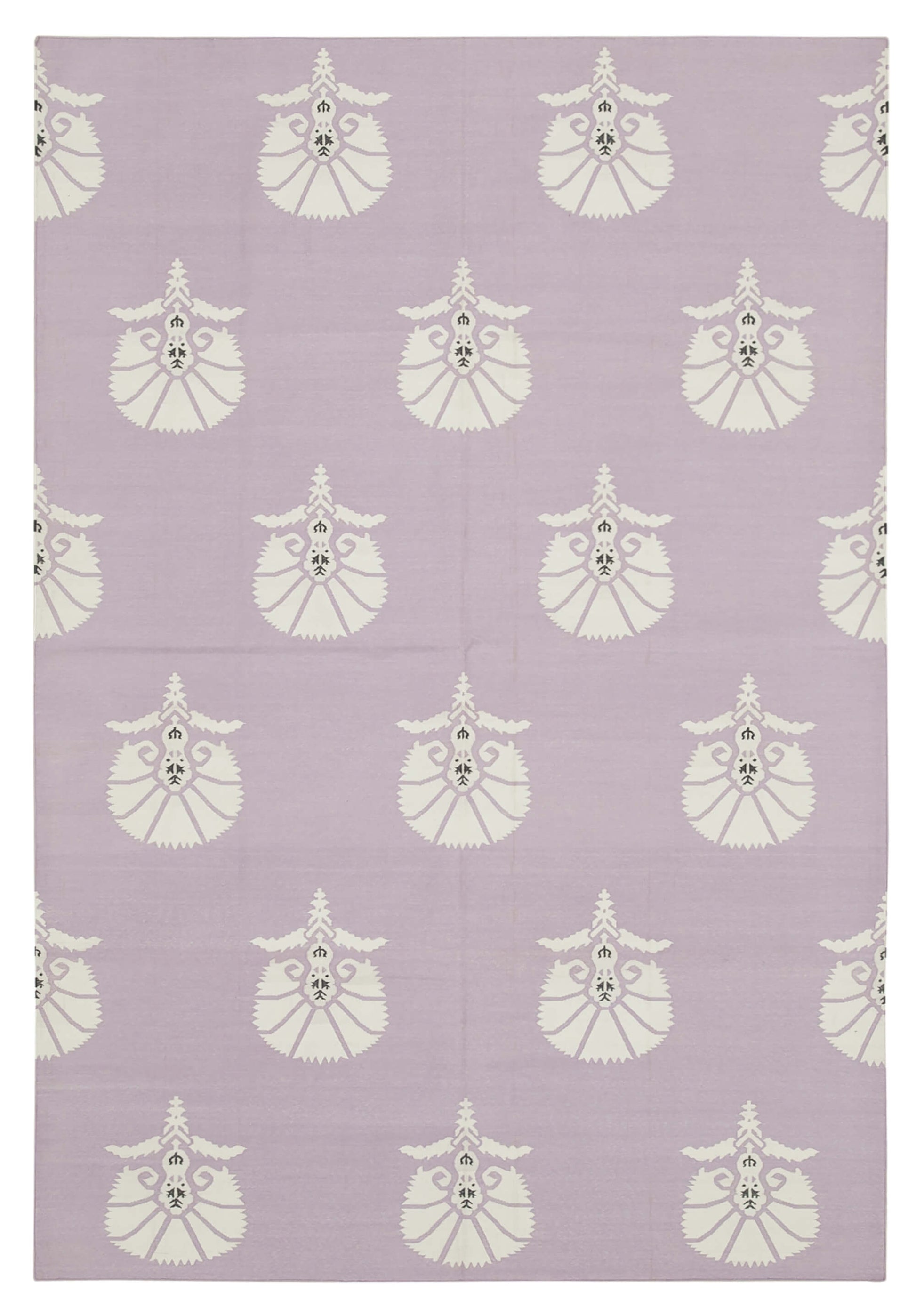 The design of this handwoven rug is a testament to the skill and artistry of its creators. The intricate patterns, featuring elegant motifs in a harmonious blend of purple and white, are both eye-catching and soothing. The cotton and wool weft and warp provide a soft yet sturdy texture, ensuring the rug's longevity. Its moderate thickness offers a plush feel without overwhelming the space. The timeless design, coupled with its subtle color scheme, makes it an ideal centerpiece for any room, whether it's a modern living area or a cozy bedroom retreat.