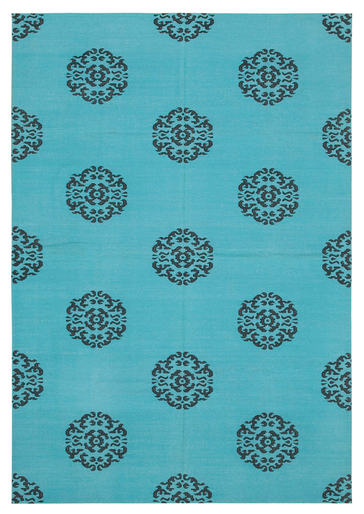 The rug features a captivating design with a vibrant turquoise background adorned with intricate black patterns. The harmonious blend of colors creates a striking visual contrast, making it a focal point in any setting. The weft and warp are meticulously crafted from cotton and wool, ensuring durability and longevity. The rug's design is both timeless and versatile, allowing it to complement a variety of interior styles, from modern to traditional. Its medium thickness adds a layer of comfort, making it ideal for high-traffic areas or cozy corners.