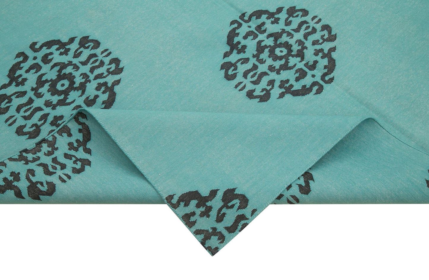 Incorporate this stunning rug into your home decor to create a focal point in any room. Place it in your living room to anchor your seating area, pairing it with neutral furniture to let the rug's colors shine. In a bedroom, position it under the bed to add warmth and texture, complementing it with matching turquoise or black accents. For a dining room, use it to define the dining space, enhancing the ambiance with coordinating tableware and centerpieces. This versatile rug can also be layered over a larger, neutral rug for added dimension and style.