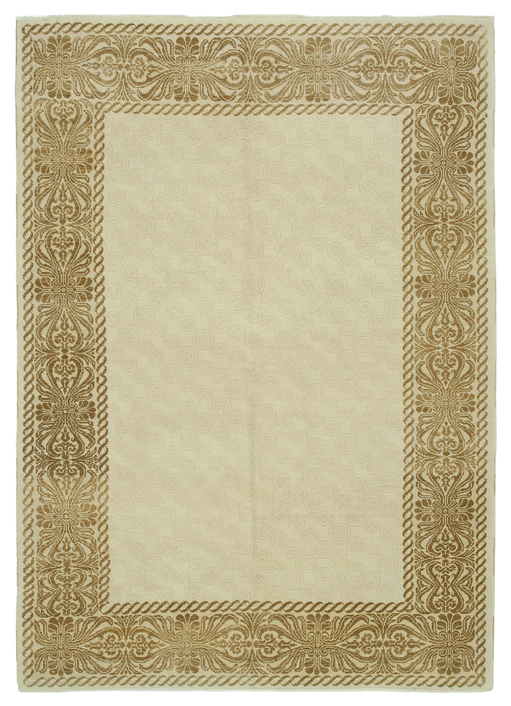 The design of this handwoven rug is a testament to the skill and artistry of its creators. The intricate border features a delicate pattern that frames the central area, adding a touch of sophistication. The use of cotton and wool in the weft and warp ensures durability and resilience, making it suitable for high-traffic areas. The neutral beige color palette allows it to seamlessly blend with various interior styles, from classic to contemporary. Its generous size makes it ideal for anchoring a seating area or defining a dining space, while the soft texture enhances the overall comfort of your home.