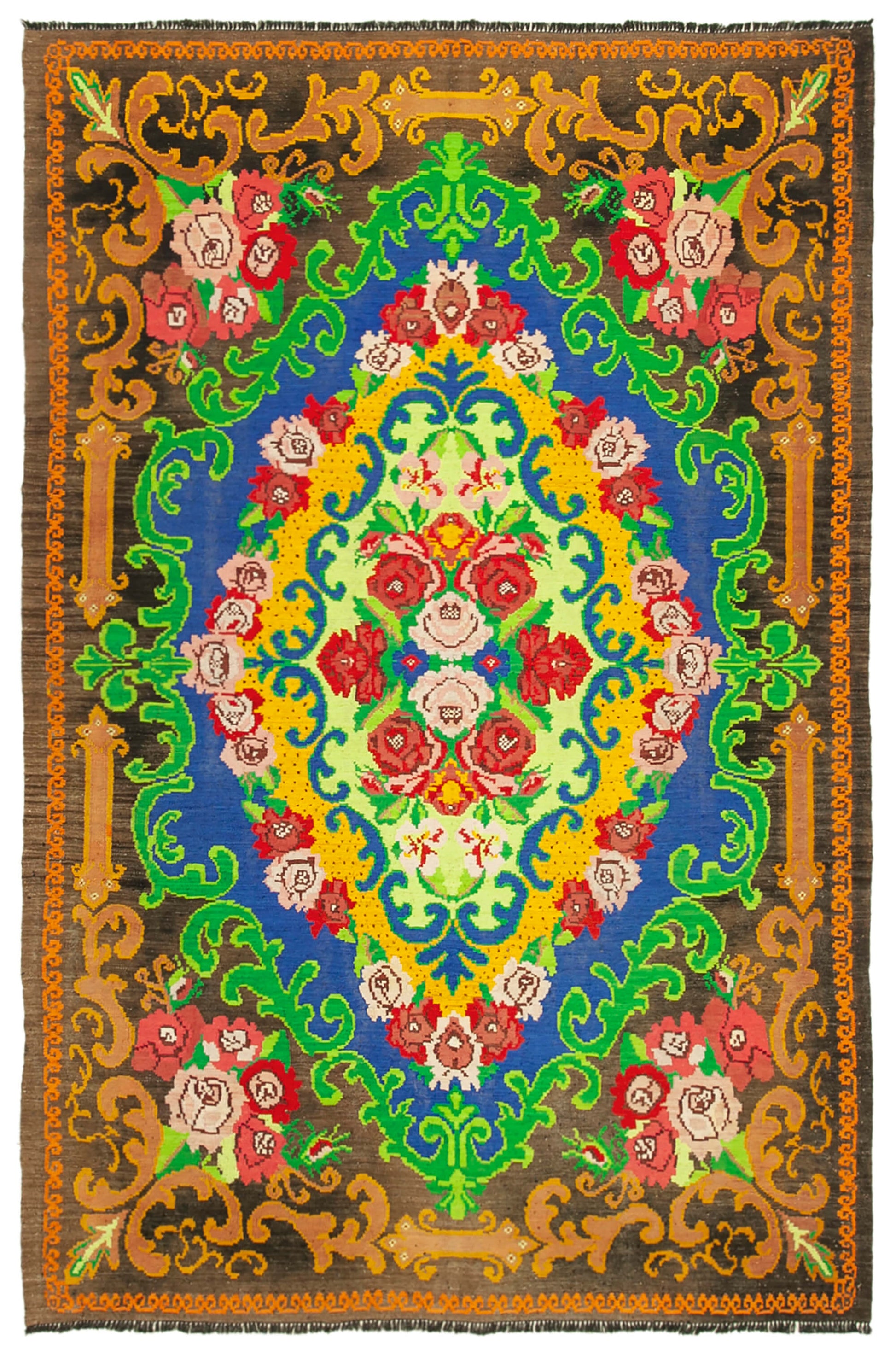 This handwoven rug features a stunning array of colors, including rich browns, vibrant greens, and deep blues, creating a captivating visual experience. The intricate floral patterns are meticulously crafted using a blend of wool and cotton, ensuring durability and a soft texture underfoot. The weft and warp are expertly woven, resulting in a thickness of approximately 0.24'' (6.00 mm), providing both comfort and resilience. The central medallion design is surrounded by ornate borders, showcasing a harmonious blend of traditional motifs and contemporary flair.