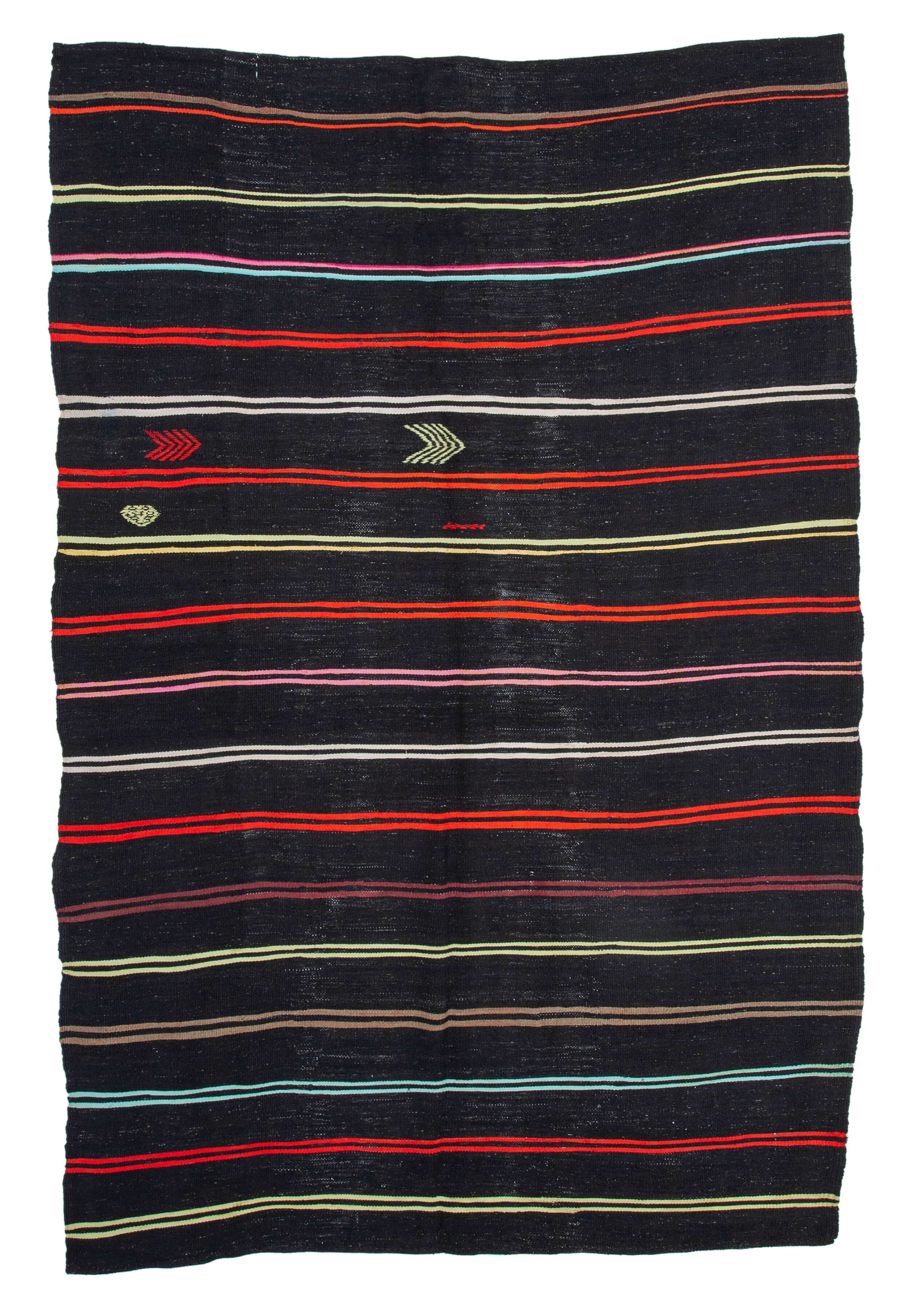 The design of this handwoven rug is a harmonious blend of tradition and style. Its rich brown base is accentuated by vibrant stripes in a variety of colors, creating a striking visual contrast. The intricate weft and warp, crafted from goat hair, add texture and depth to the piece. The rug's age, ranging from 60 to 80 years, imbues it with a sense of history and character, making it a unique addition to any room. The subtle variations in color and pattern reflect the artisan's touch, ensuring that each rug is one-of-a-kind.