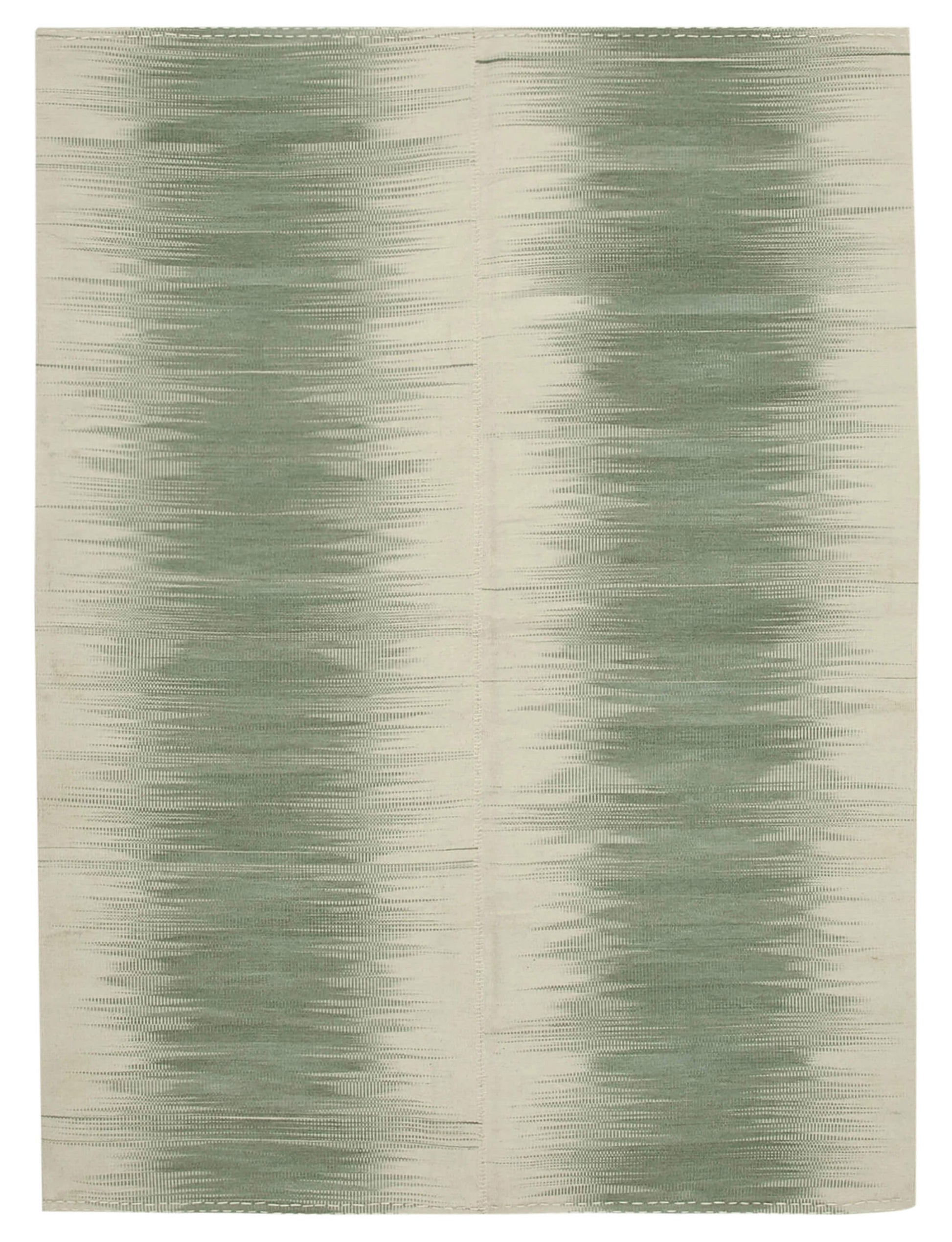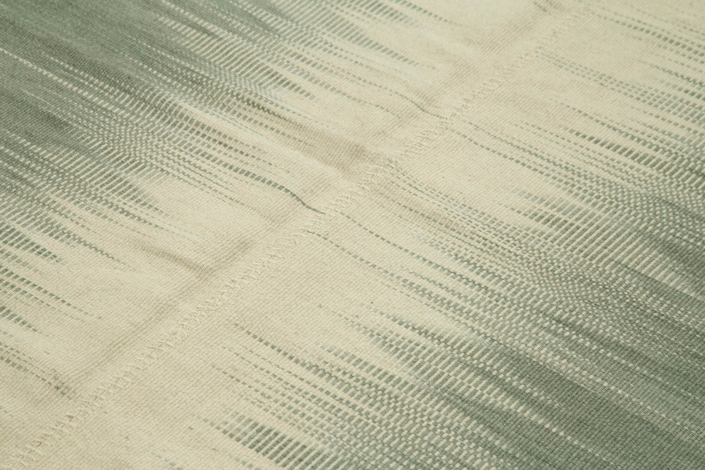 The design of this handwoven rug is a harmonious blend of green and beige tones, creating a soothing and versatile color palette. The subtle gradient pattern adds depth and interest, making it a focal point in any room. The use of cotton and wool in the weft and warp provides a sturdy yet flexible structure, ensuring longevity and resilience. The rug's age adds a vintage charm, while its contemporary design elements make it suitable for both classic and modern interiors. Its dimensions make it ideal for larger spaces, such as living rooms or dining areas, where it can be showcased in all its glory.