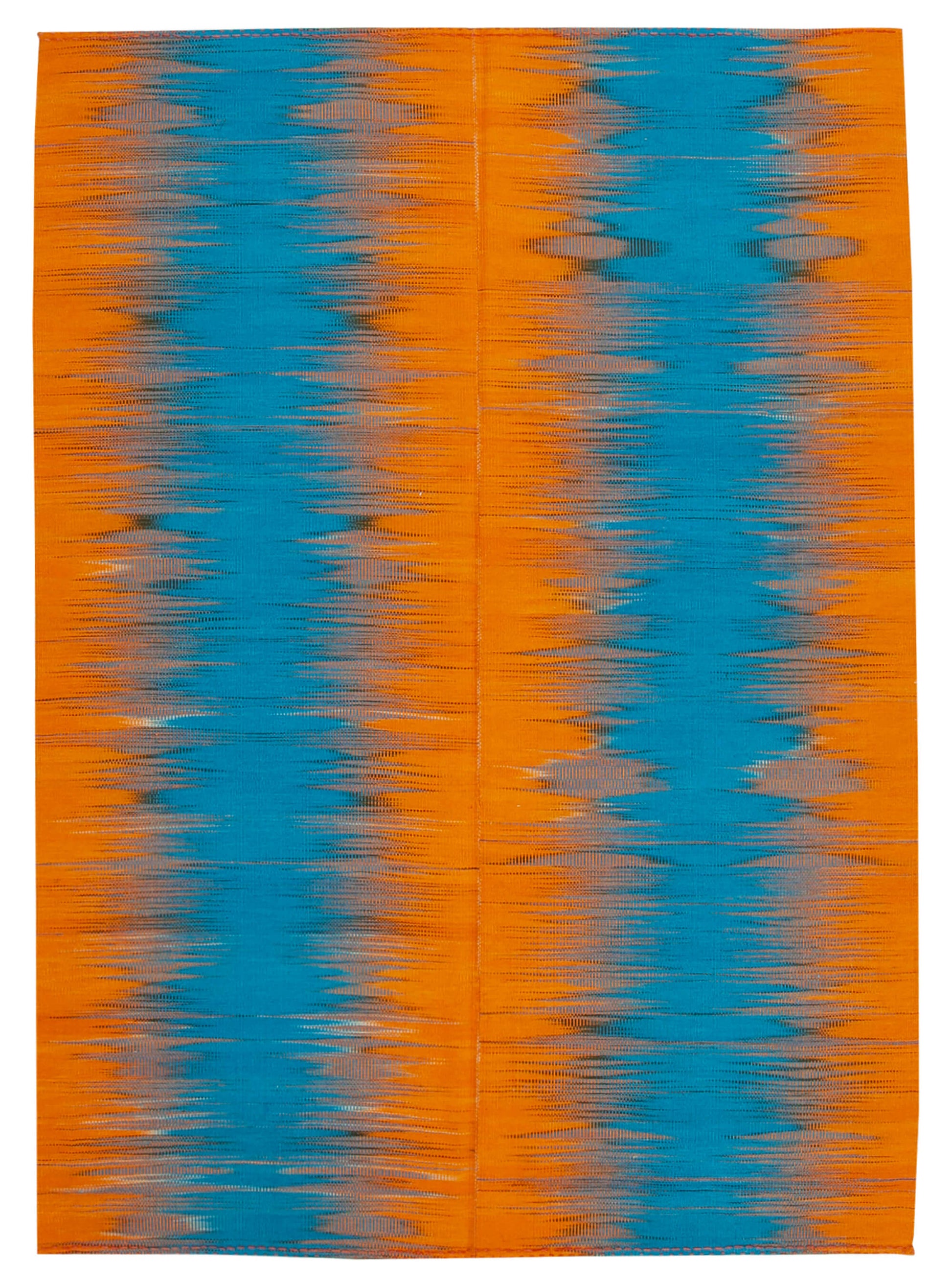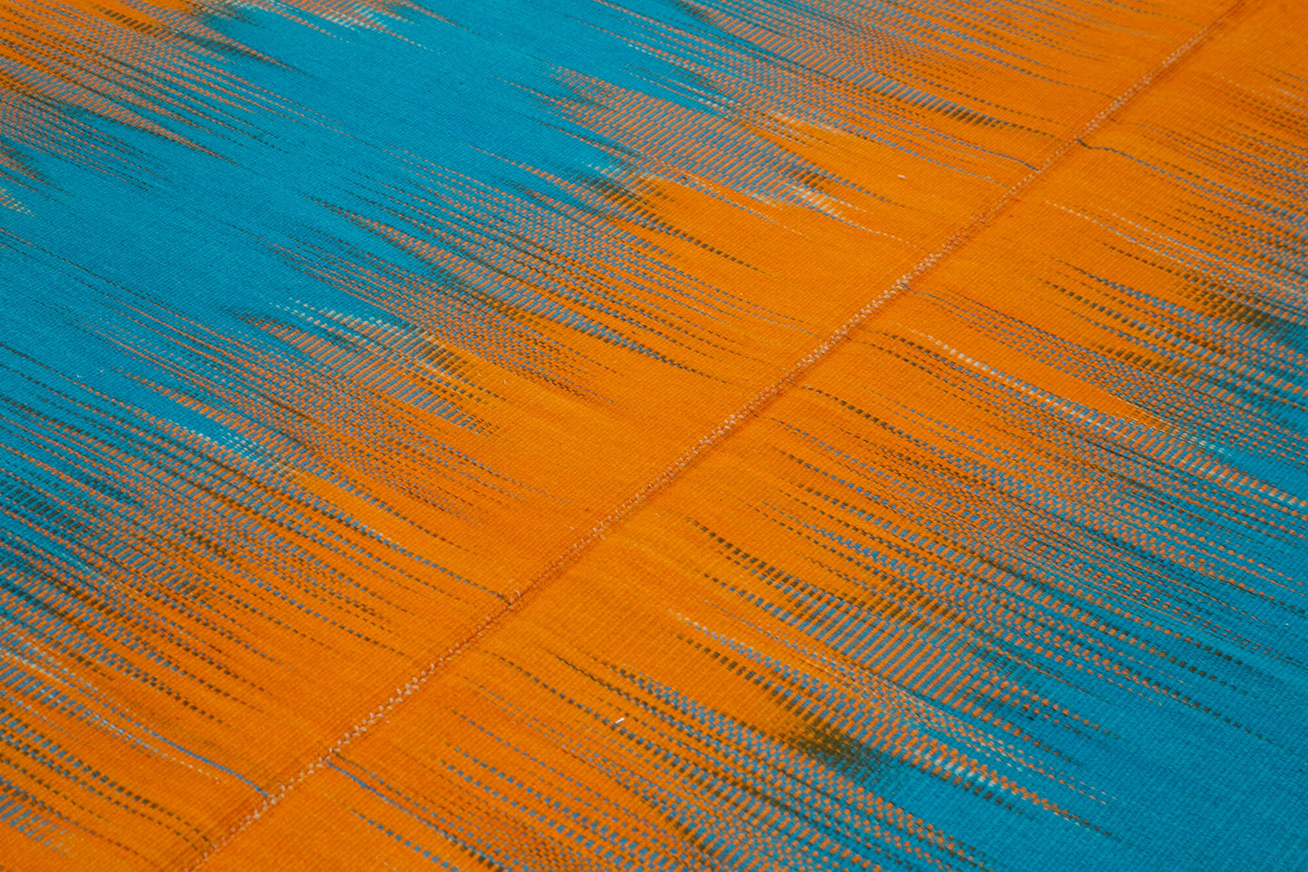 The rug features a striking interplay of orange and blue hues, creating a dynamic visual impact. The vibrant colors are woven into a captivating pattern that draws the eye and adds a sense of movement to the space. The cotton and wool weft and warp provide a soft yet sturdy texture, making it ideal for high-traffic areas. The harmonious blend of colors and materials reflects a perfect balance between tradition and contemporary design, making it a versatile piece for various interior styles.