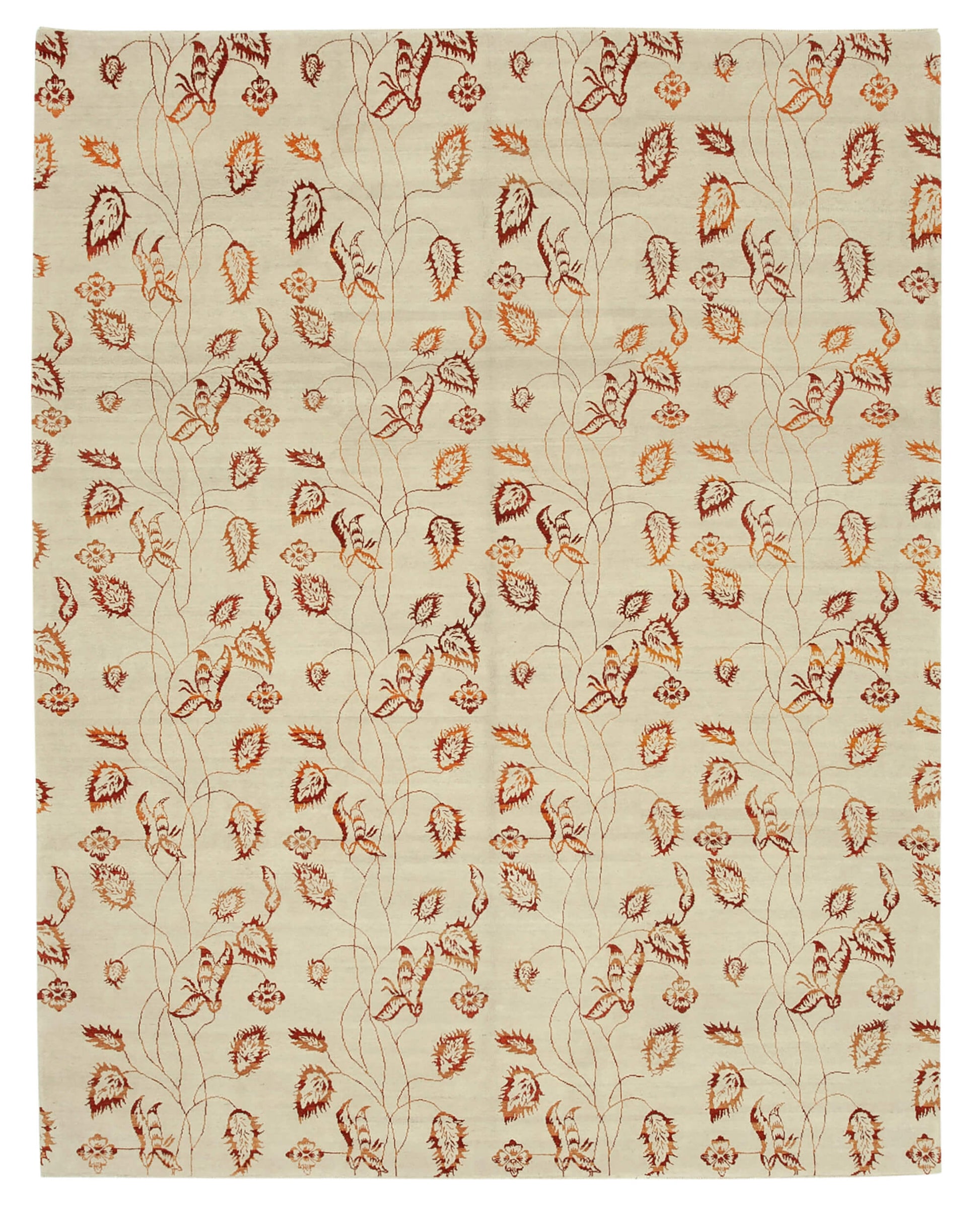 The rug features a captivating design with a harmonious blend of beige and red hues. The intricate patterns of leaves and floral motifs are meticulously woven, showcasing the skill and artistry of its creators. The use of cotton and wool in the weft and warp ensures durability and a soft texture, making it a practical yet luxurious choice. The warm color palette of beige and red adds a touch of sophistication, making it a versatile piece that complements various interior styles, from classic to contemporary.