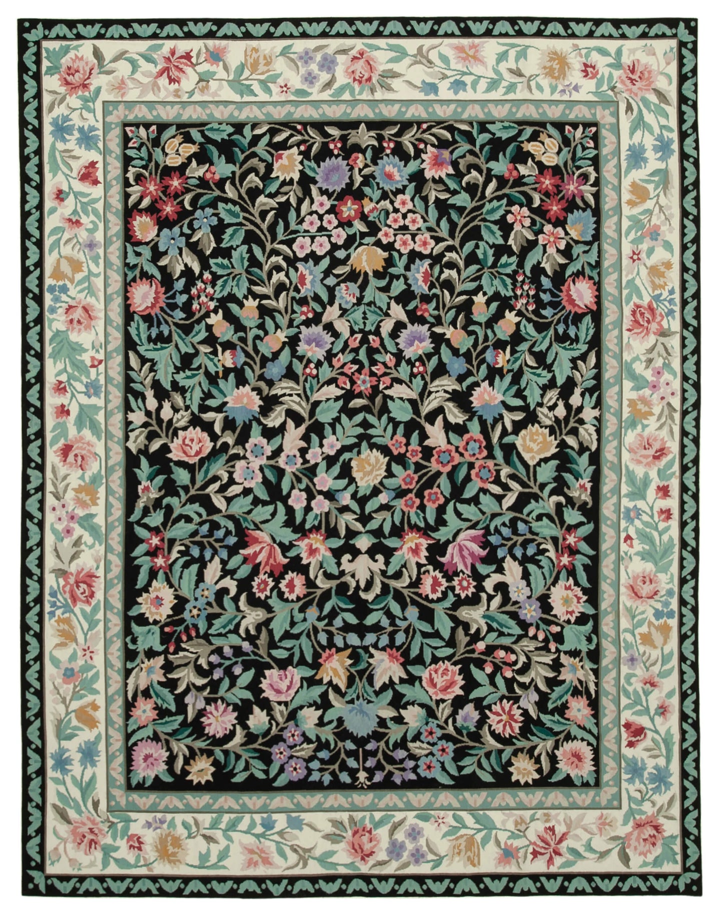 The intricate design of this rug is a testament to the skill and artistry of its creators. The weft and warp are meticulously crafted from cotton and wool, ensuring a soft yet resilient texture. The black background serves as a dramatic canvas for the multicolor floral patterns that dance across the surface, creating a lively and inviting atmosphere. The border features a harmonious blend of floral motifs, adding depth and dimension to the overall design. This rug is not just a floor covering; it's a work of art that tells a story of tradition and creativity.
