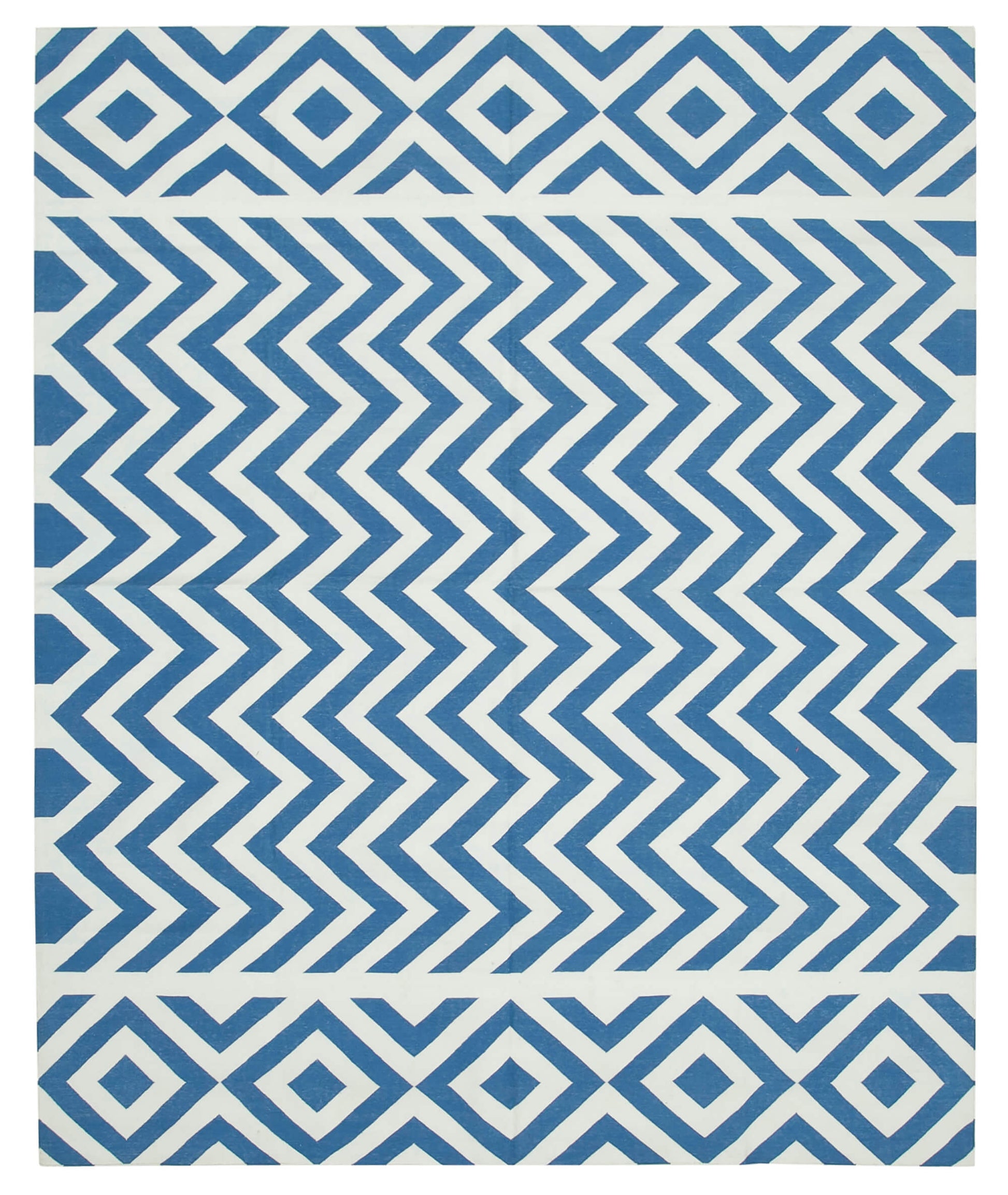 The rug features a striking geometric pattern in a vibrant blue color, creating a bold visual statement. The intricate design showcases a series of zigzag and diamond motifs, adding depth and character to the piece. The use of cotton and wool in the weft and warp ensures durability and resilience, making it suitable for high-traffic areas. The harmonious blend of materials and colors makes this rug a versatile choice, complementing both contemporary and traditional interiors.
