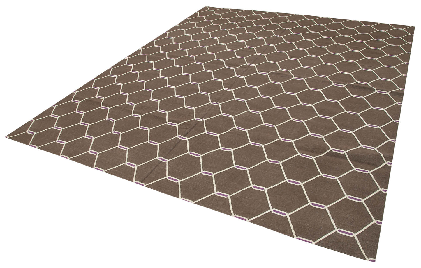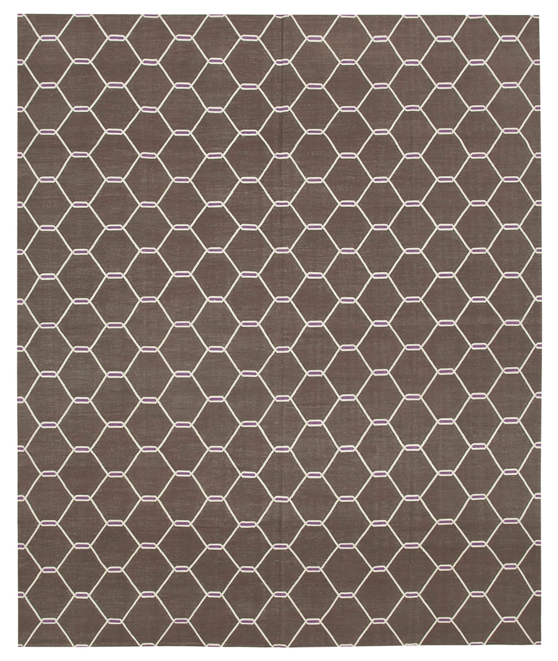 The rug features a captivating geometric pattern in a warm brown hue, accented by subtle hints of other colors. The intricate design is a testament to the skill of the artisans who crafted it, with each hexagonal motif meticulously woven to create a harmonious and balanced look. The cotton and wool blend ensures durability and softness, making it an ideal choice for high-traffic areas. The neutral color palette allows it to seamlessly blend with various interior styles, from contemporary to classic.