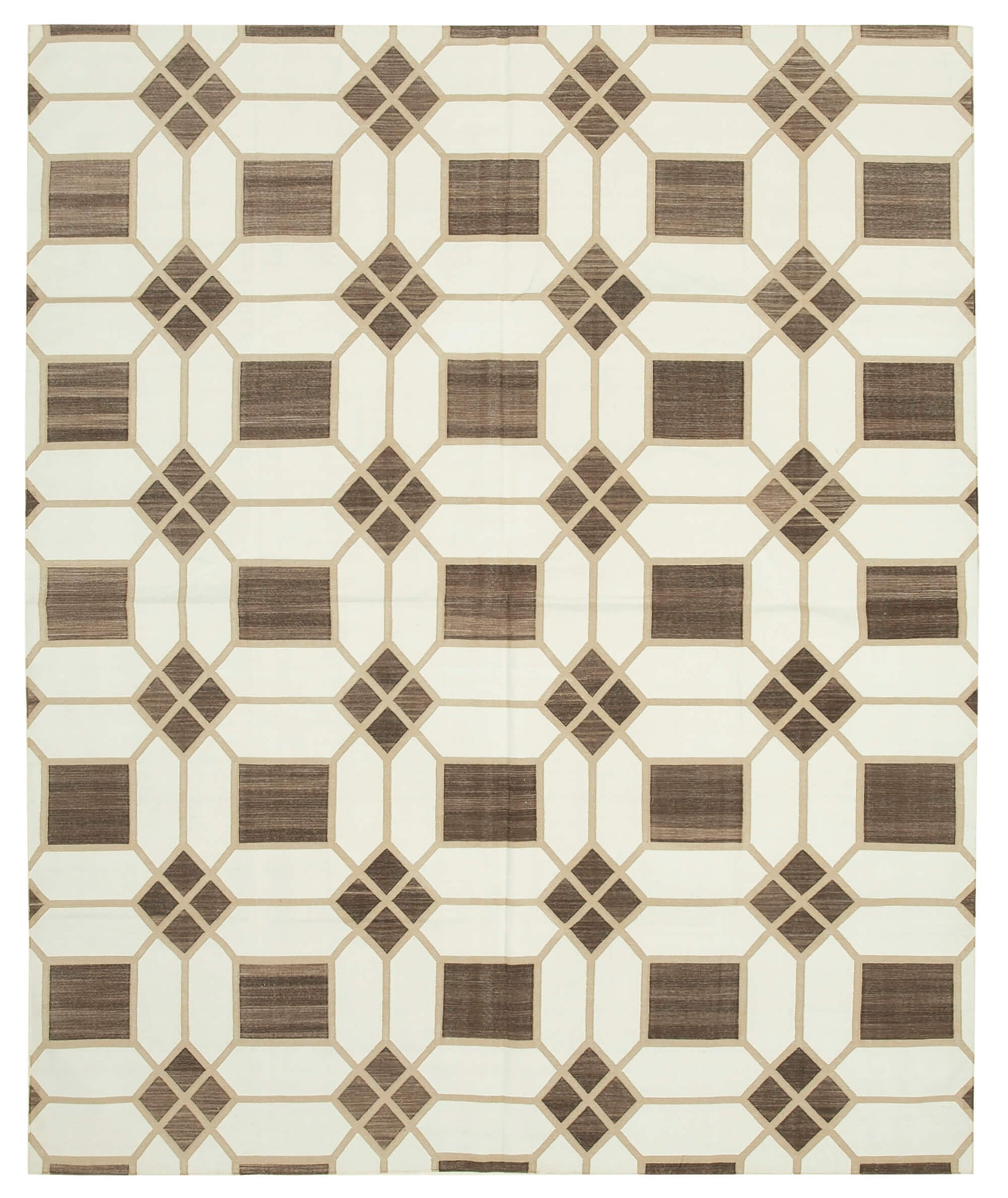 The rug features a captivating geometric pattern in shades of brown, creating a harmonious blend of classic and contemporary aesthetics. The intricate design showcases a series of interlocking shapes, adding depth and dimension to the piece. The use of cotton and wool in the weft and warp ensures durability and softness, making it ideal for high-traffic areas. The neutral color palette allows for versatile styling, seamlessly integrating into various decor themes, from minimalist to eclectic.