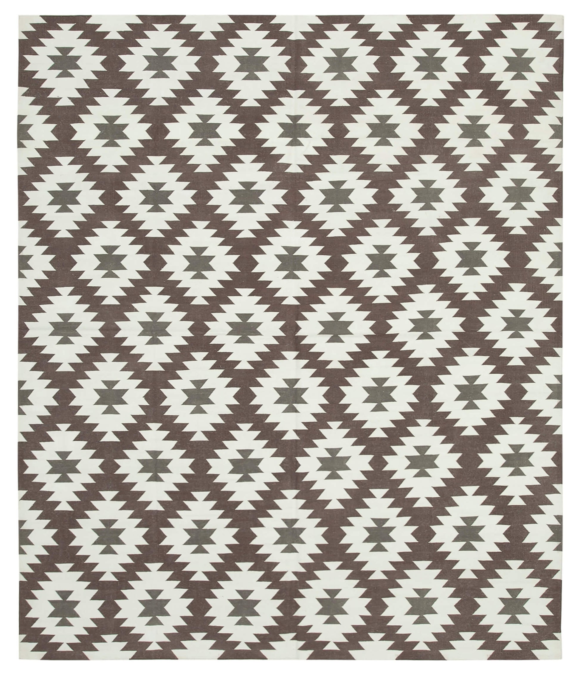 The design of this rug is a harmonious blend of traditional and contemporary elements. Featuring a striking geometric pattern in rich brown and cream tones, it effortlessly complements a variety of interior styles. The intricate motifs are meticulously woven, showcasing the skill and dedication of the artisans. The cotton and wool weft and warp provide a sturdy structure, ensuring the rug maintains its shape and beauty over time. Its neutral color palette allows it to seamlessly integrate into any decor, while the bold pattern adds a touch of sophistication and elegance.