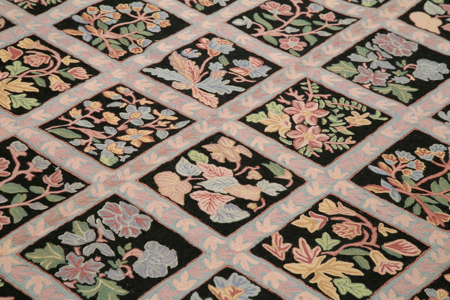 This rug features a harmonious blend of cotton and wool in its weft and warp, ensuring durability and a soft texture underfoot. With a thickness of approximately 0.16'' (4.00 mm), it provides a comfortable and plush feel. The intricate design showcases a captivating array of floral patterns, each square meticulously crafted to create a cohesive and visually stunning mosaic. The color palette, dominated by rich purples and complemented by subtle pastels, adds depth and vibrancy, making it a versatile addition to various interior styles.