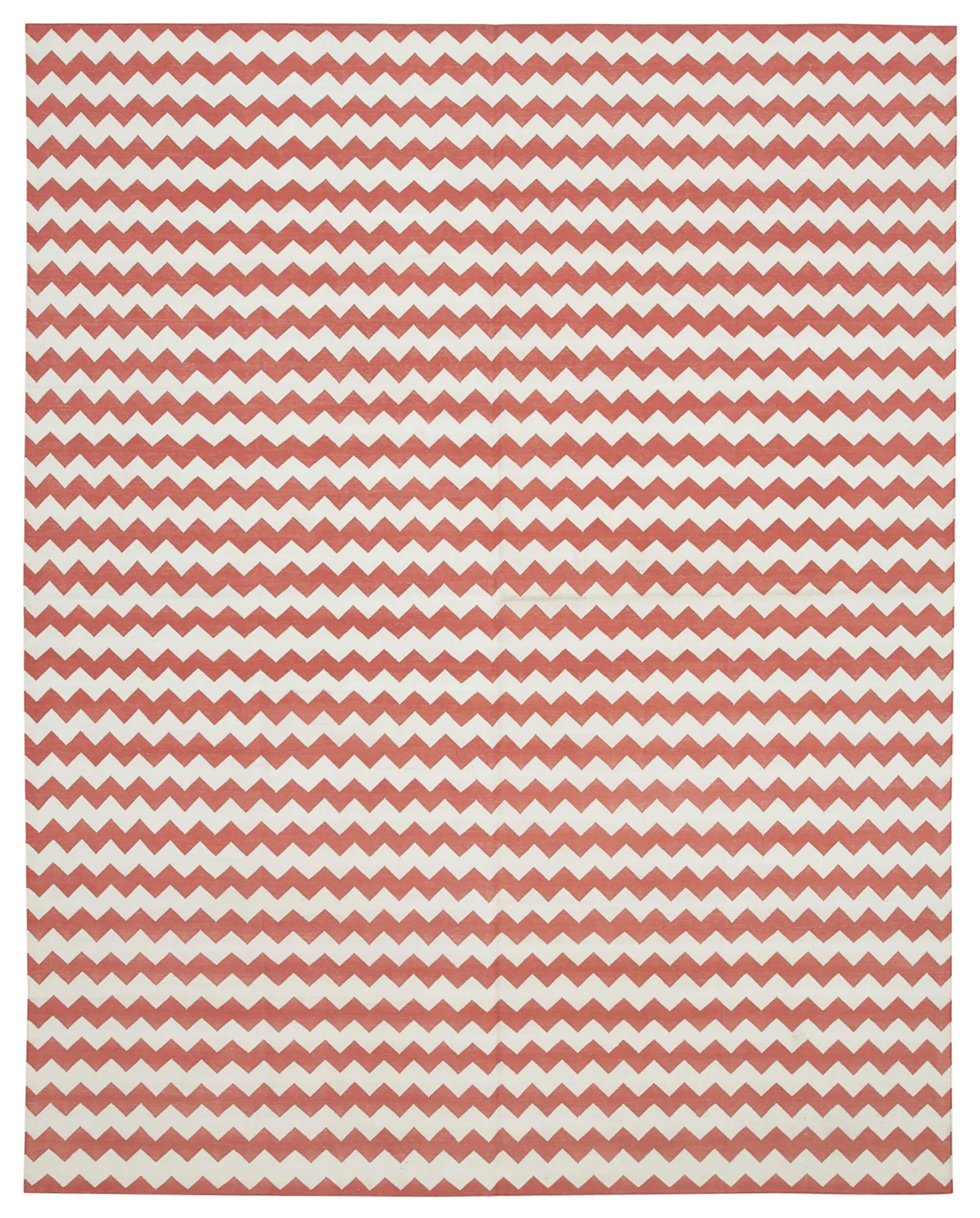 The rug features a striking zigzag pattern in vibrant red and cream, creating a dynamic visual appeal that can enhance any decor. The intricate weft and warp of cotton and wool ensure durability and a soft texture, making it ideal for high-traffic areas. The bold color palette and geometric design make this rug a standout piece, perfect for adding a touch of elegance and warmth to your living room, bedroom, or office space.