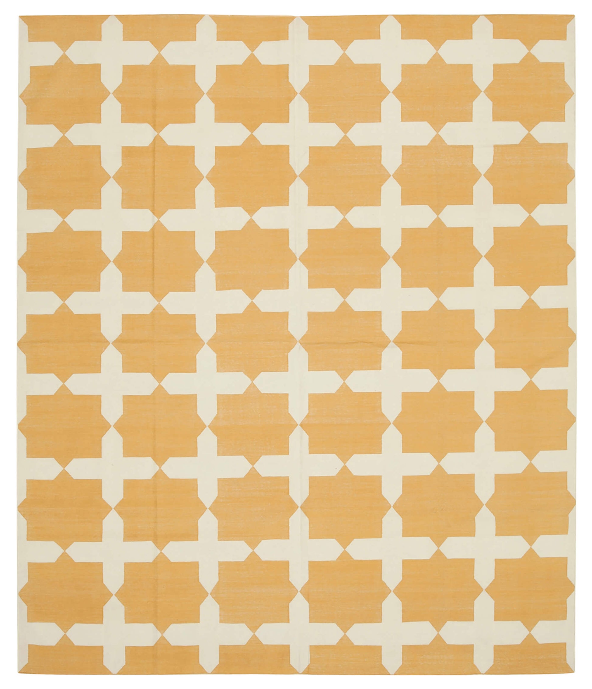 The design of this rug is a harmonious blend of geometric patterns and vibrant colors. The dominant yellow hue is complemented by a subtle cream, creating a striking visual contrast that draws the eye. The geometric pattern, reminiscent of traditional motifs, adds a touch of elegance and sophistication. This rug's design is versatile, making it suitable for both contemporary and classic interiors. The use of high-quality cotton and wool ensures that the colors remain vibrant and the rug maintains its shape over time, providing you with a timeless piece that will enhance your home for years to come.