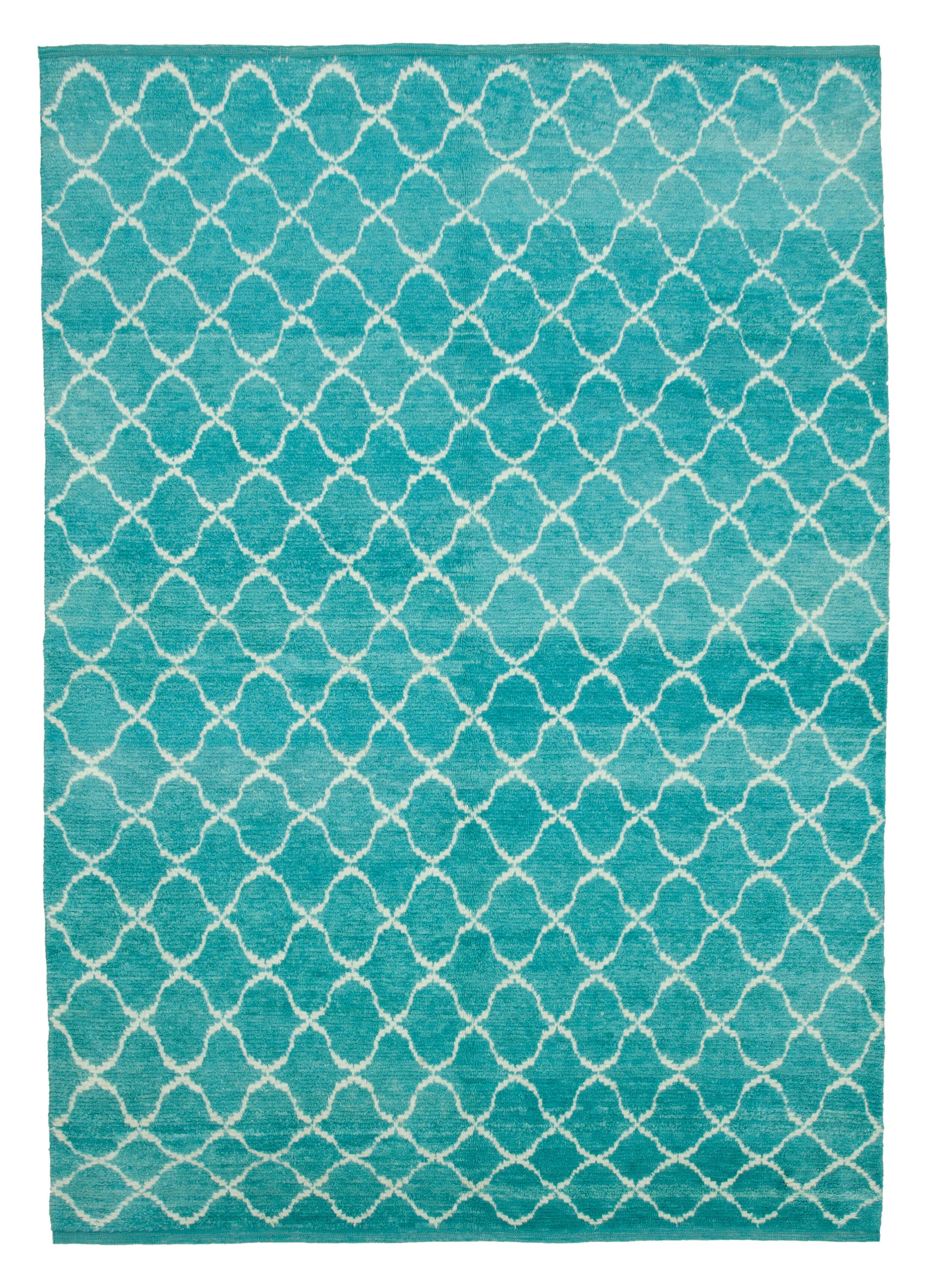 Incorporate this stunning rug into your home decor to create a focal point in your living room or bedroom. Pair it with neutral furniture to let the vibrant turquoise color stand out, or complement it with matching accents like cushions or throws. The rug's geometric pattern can be echoed in other decor elements, such as wall art or vases, to create a cohesive look. For a bohemian touch, layer it with other rugs of varying textures and sizes. This versatile piece can also be used to define a seating area or add warmth to a hardwood floor.