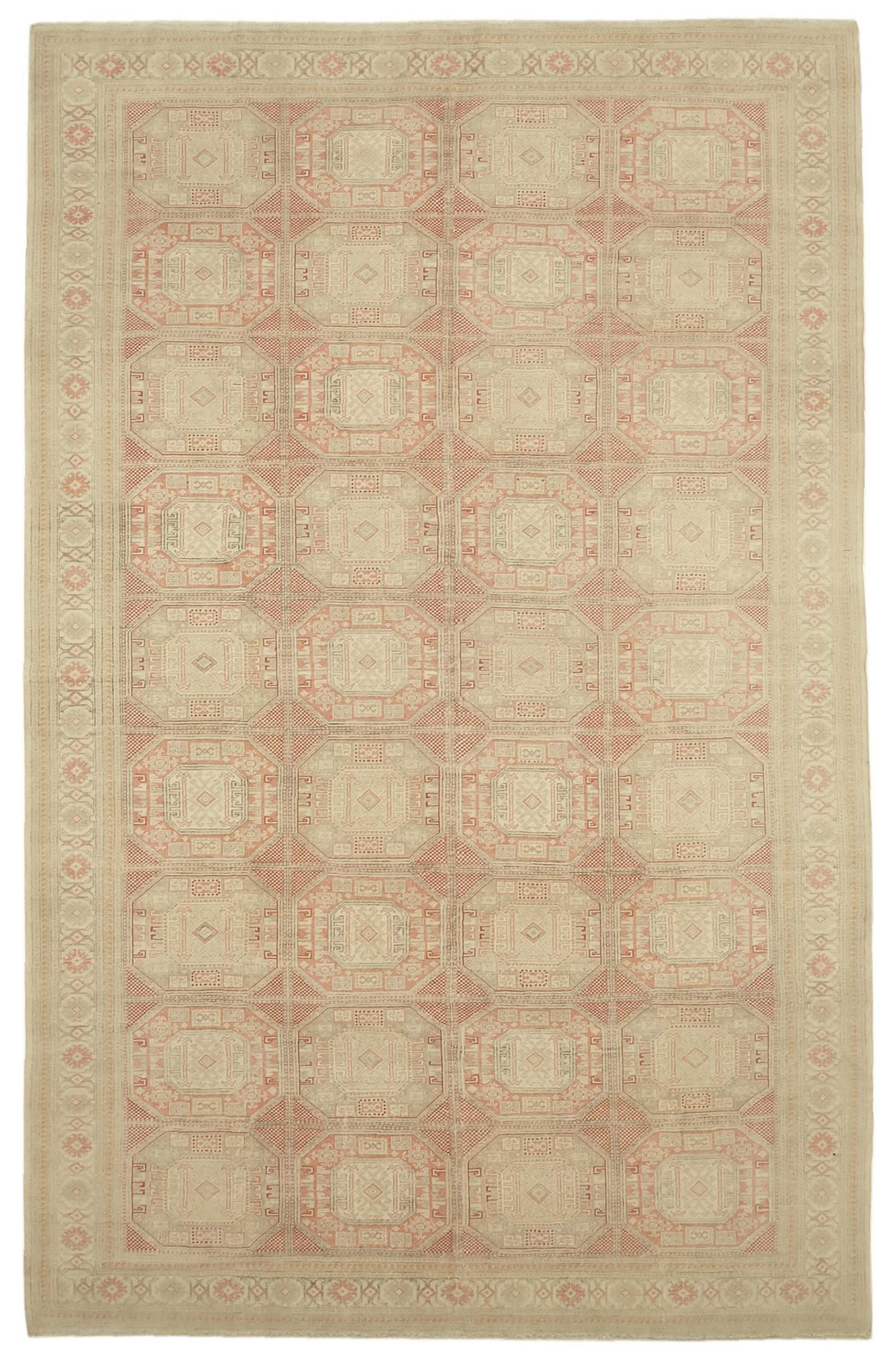 Step into a world of timeless elegance with our exquisite handwoven rug. This masterpiece, with its rich history and intricate design, is more than just a floor covering; it's a statement piece that adds warmth and sophistication to any space. Measuring an impressive 12'6'' (380 cm) in length and 8'0'' (243 cm) in width, this rug is crafted from a blend of cotton and wool, ensuring durability and comfort underfoot. With an age range of 30-40 years, it carries a legacy of craftsmanship that is both rare and beautiful. The subtle thickness of approximately 0.20'' (5.00 mm) adds a plush feel, while the soft beige tones create a serene and inviting atmosphere.