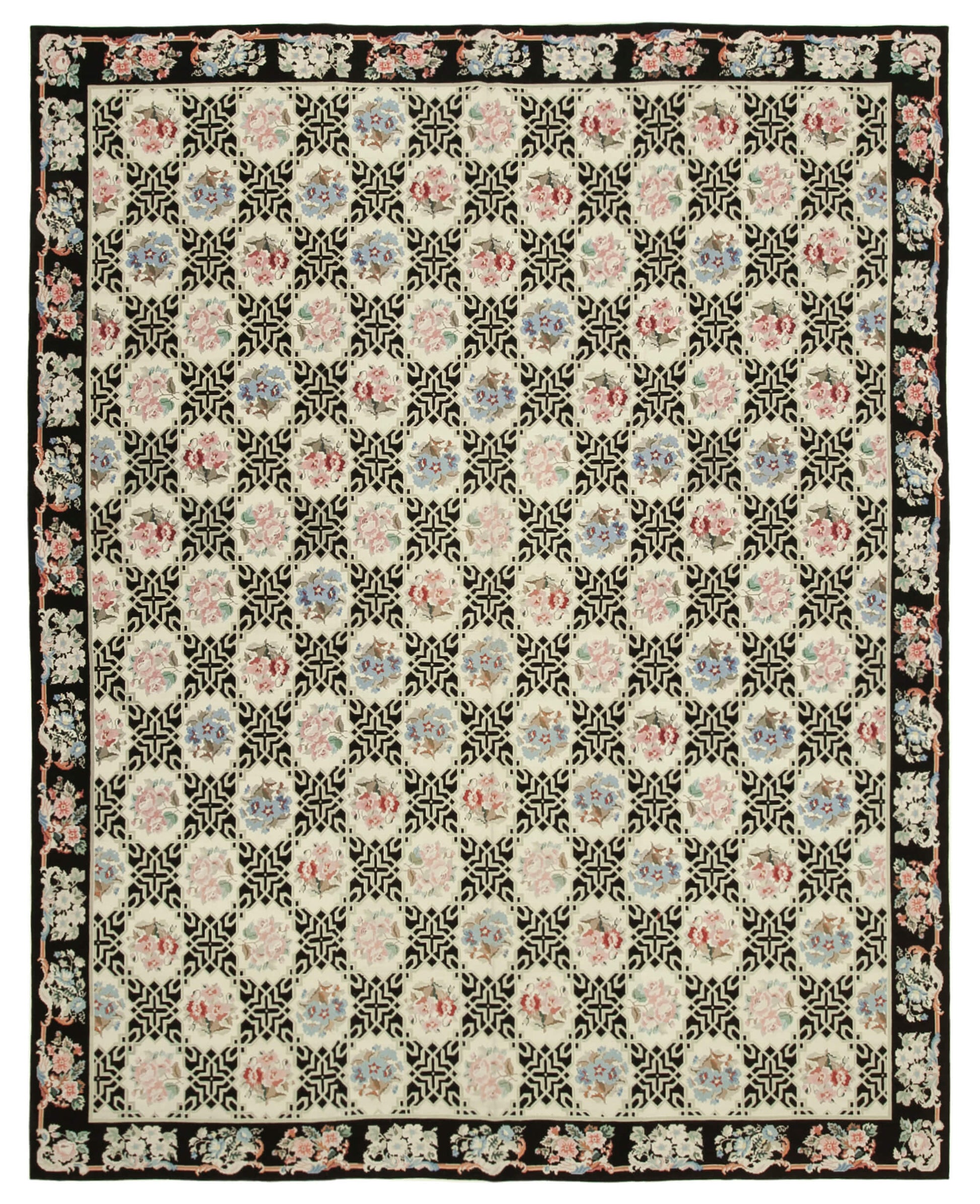 The intricate design of this rug is a testament to the skill and artistry of its creators. Featuring a harmonious blend of beige and black, the rug's pattern is both sophisticated and versatile, making it suitable for a variety of interior styles. The weft and warp are meticulously crafted from cotton and wool, providing a soft yet resilient texture. The floral motifs, set against a geometric backdrop, create a stunning visual contrast that draws the eye and adds depth to the design. This rug is not just a floor covering; it's a work of art that elevates any space.