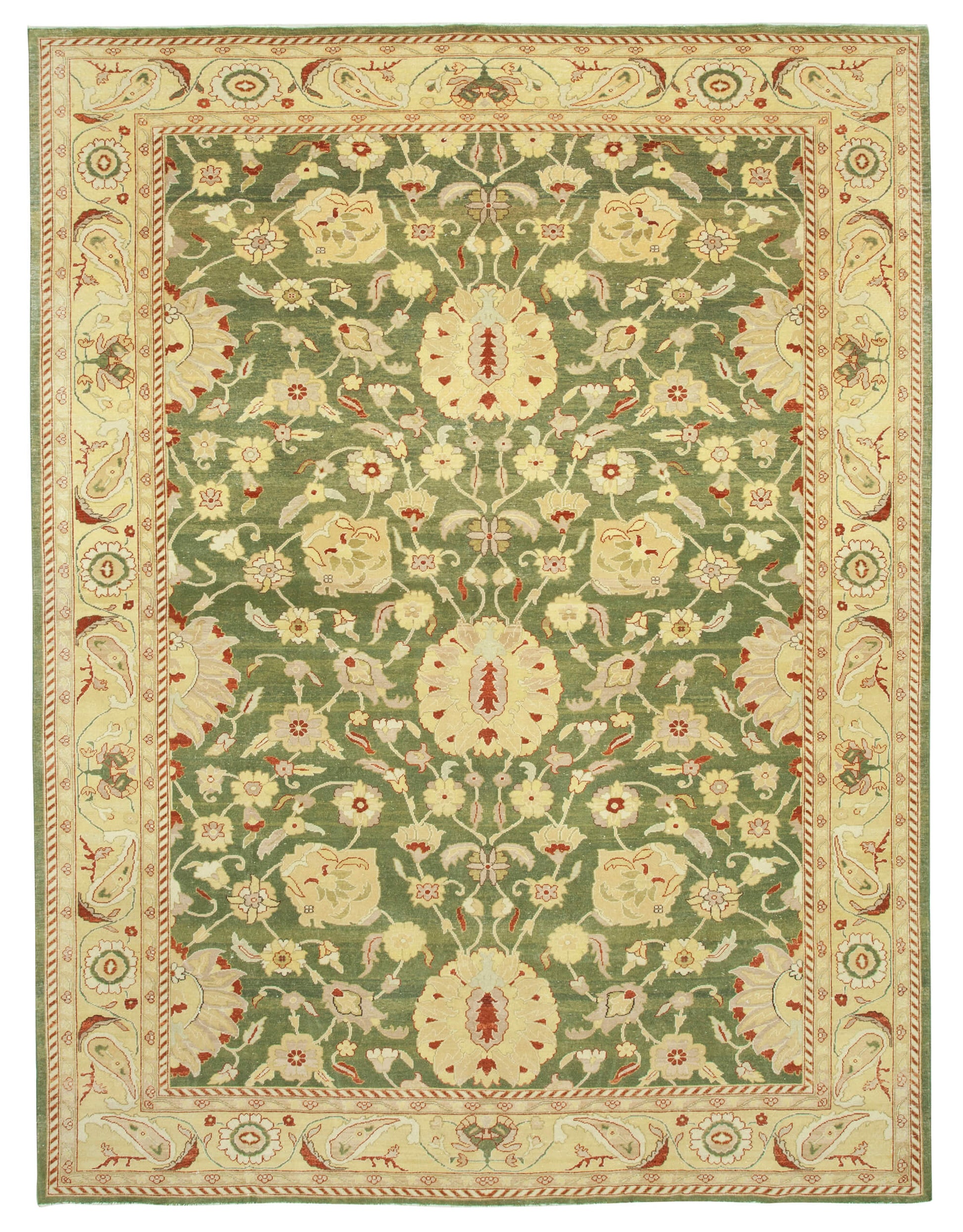 The intricate design of this rug features a harmonious blend of beige and green hues, creating a soothing and elegant palette. The central medallion and floral motifs are meticulously woven, showcasing the skill and artistry of traditional rug-making techniques. The border is adorned with detailed patterns that frame the central design beautifully, adding depth and character. The use of cotton and wool in the weft and warp ensures a soft texture and resilience, making it perfect for high-traffic areas. This rug's classic design and color scheme make it versatile, complementing both modern and traditional interiors.