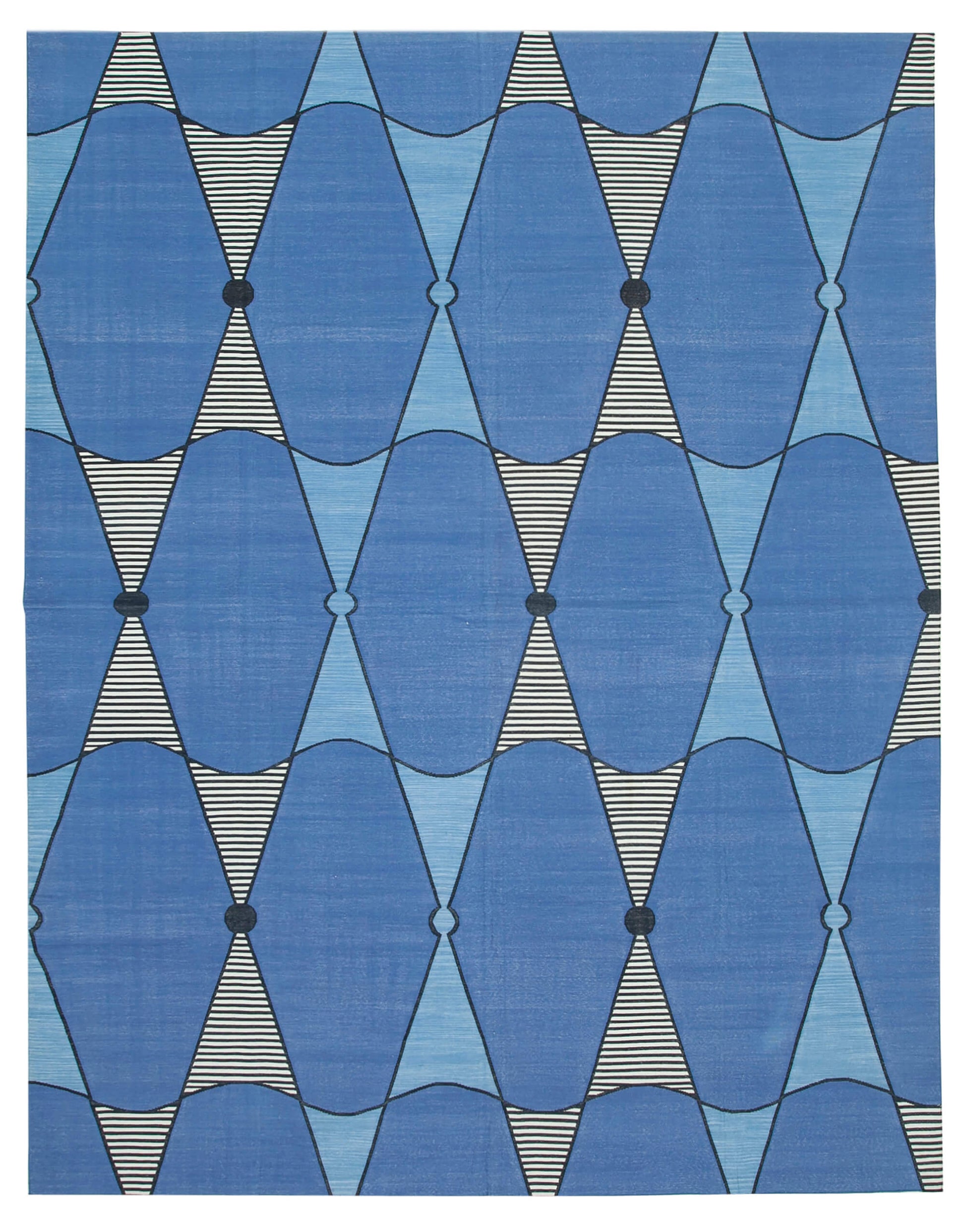 The design of this handwoven rug is a testament to the skill and artistry of its creators. Featuring a striking geometric pattern, the rug showcases a series of interconnected shapes that draw the eye and create a sense of movement. The intricate weft and warp of cotton and wool ensure a high-quality finish, while the bold blue color palette adds a modern twist to the traditional design. The rug's durability is enhanced by its substantial thickness, making it suitable for high-traffic areas. Its unique pattern and color scheme make it a standout piece that can anchor any room, from a cozy living area to a sophisticated dining space.