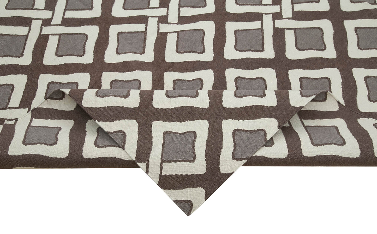 The design of this rug is a harmonious blend of classic and modern elements. Featuring a striking geometric pattern in rich brown tones, it effortlessly complements a variety of interior styles. The intricate weft and warp of cotton and wool create a textured surface that enhances its visual appeal. The rug's color palette, dominated by earthy browns, adds depth and warmth to your space, making it a versatile addition to both contemporary and traditional settings. Its timeless design ensures that it remains a focal point in your home for years to come.