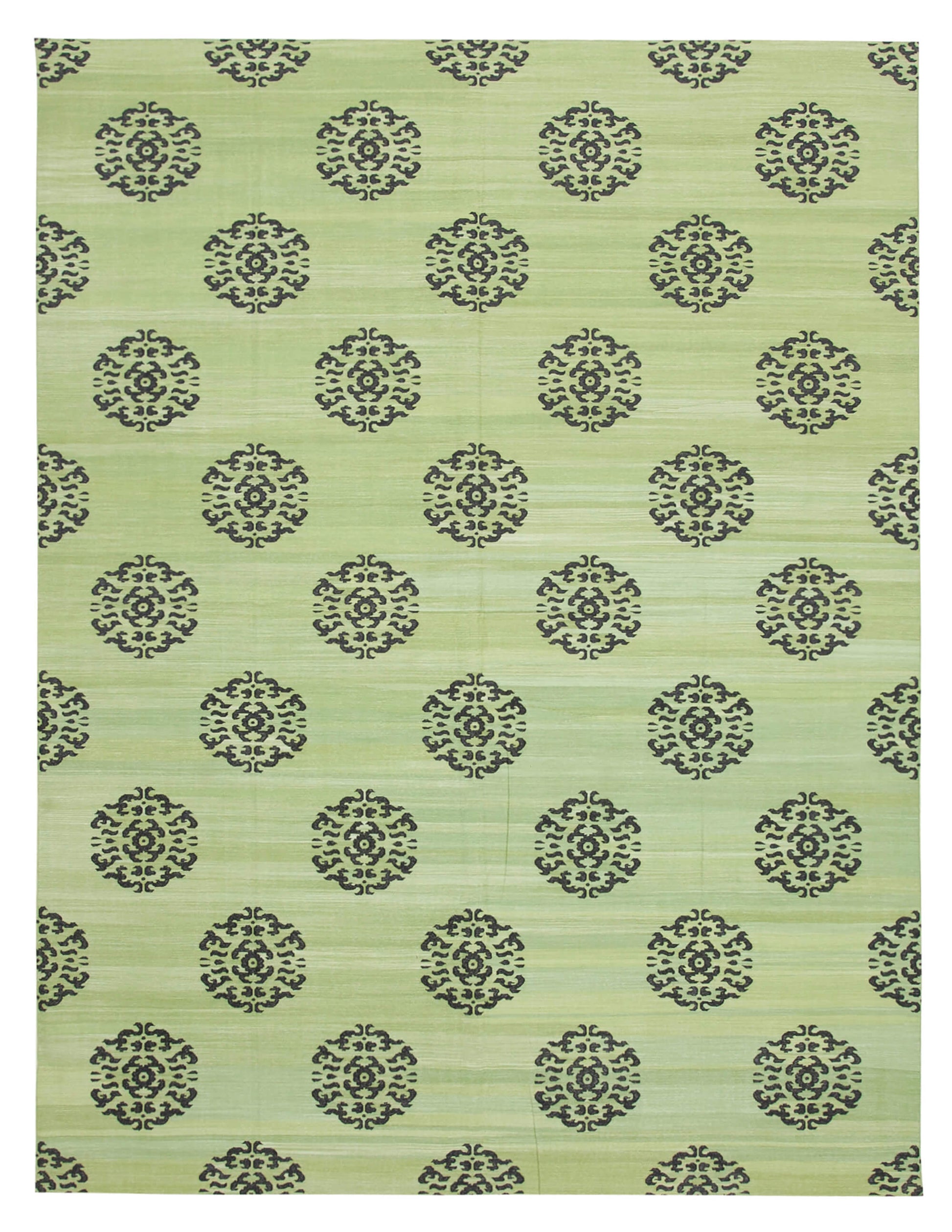 The rug features a captivating design with a soothing green background adorned with intricate black medallion patterns. This harmonious color combination brings a sense of tranquility and sophistication to any room. The weft and warp of cotton and wool not only enhance its durability but also contribute to its soft texture. The meticulous handwoven technique ensures each piece is unique, reflecting the skill and dedication of the artisans. Its medium thickness makes it versatile, suitable for both high-traffic areas and cozy corners.