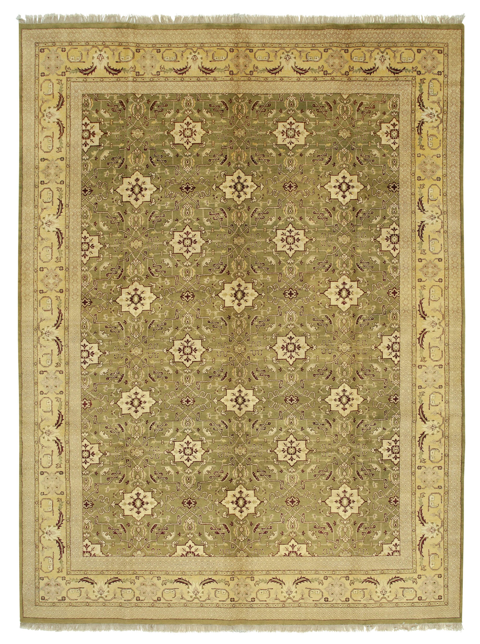 The intricate design of this rug is a testament to the skill and artistry of its creators. Featuring a harmonious blend of green and other subtle hues, the rug's pattern is both captivating and soothing. The central motif is surrounded by a series of elegant borders, each adding depth and character to the overall design. The use of cotton and wool in the weft and warp not only enhances the rug's texture but also ensures its longevity. This piece is perfect for those who appreciate the beauty of traditional design with a modern twist.