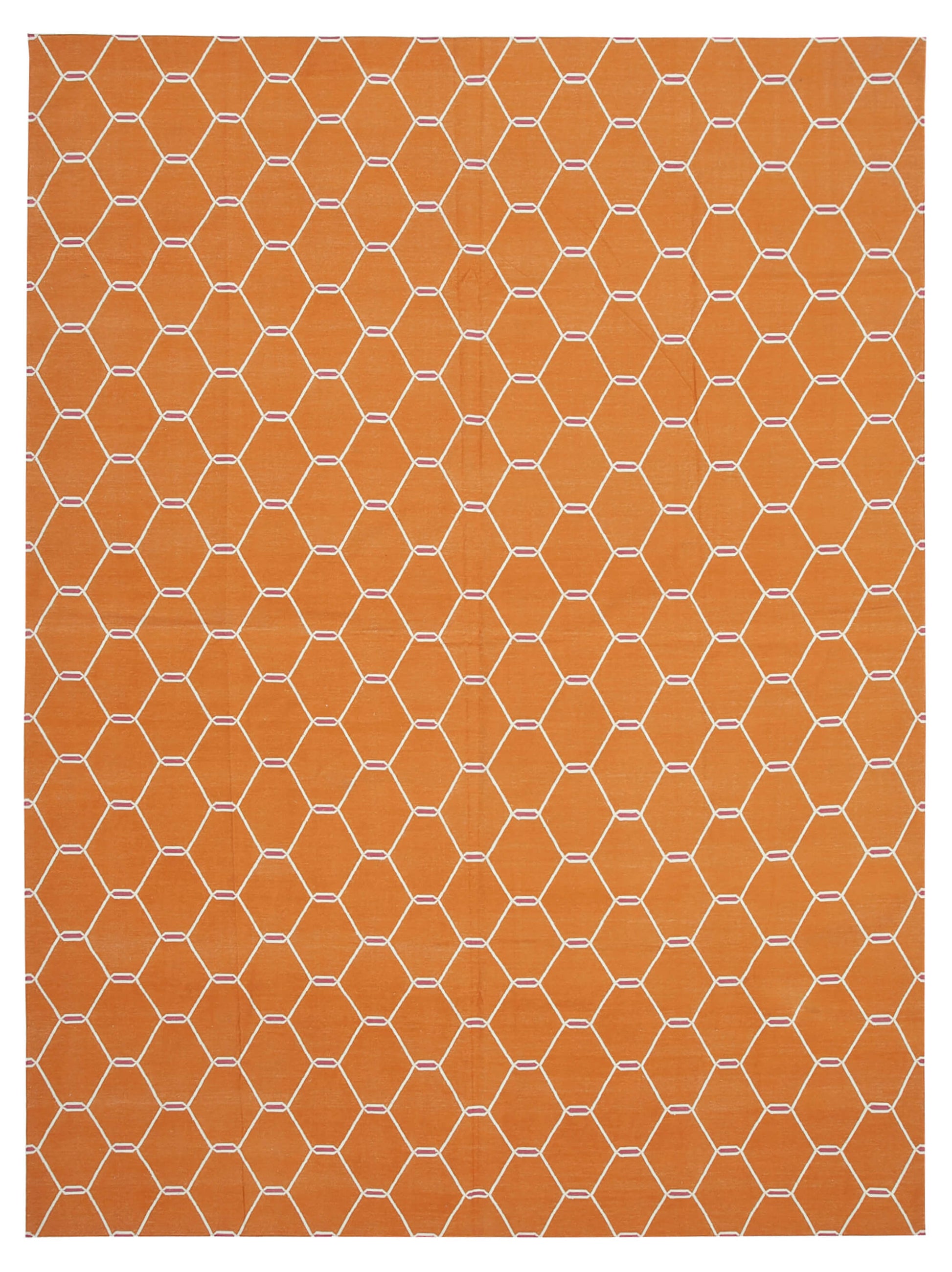 Incorporate this stunning rug into your home decor to create a focal point in your living room or bedroom. Pair it with neutral-toned furniture to let the vibrant orange color stand out, or complement it with bold, contrasting cushions and throws for a more eclectic look. The geometric pattern can be echoed in other decor elements, such as wall art or decorative accessories, to create a cohesive design theme. This rug also works beautifully in dining areas, adding warmth and texture under a wooden dining table.