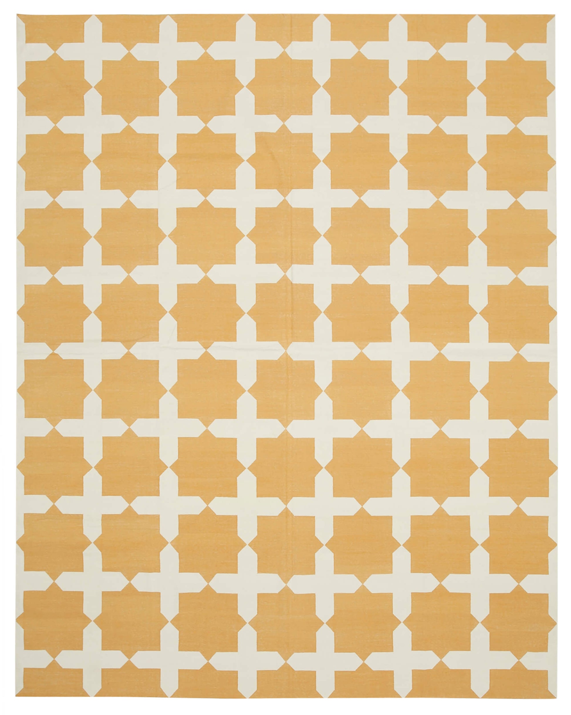 The rug features a captivating geometric pattern in a harmonious blend of yellow and white, creating a striking visual impact. The intricate design showcases the skillful artistry of handweaving, with each motif meticulously crafted to perfection. The cotton and wool weft and warp provide a soft yet sturdy texture, making it ideal for high-traffic areas. The vibrant yellow hue adds a pop of color, while the white elements offer a refreshing contrast, making it a versatile piece that complements various interior styles.